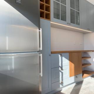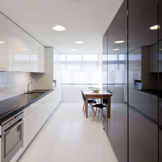 具有反射效果的材質不論使用在任何的居家空間中,都能有放大的效果。因此你可以加裝玻璃拉門,或是利用有反射效果的鏡面,讓小廚房看起來比實際上還要大。