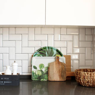 由於煮菜的時候油煙難免會噴到牆壁上,為了讓之後的清潔工作更輕鬆,你可以在牆壁上貼上能簡單去污的壁紙。