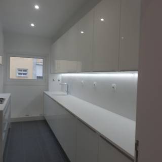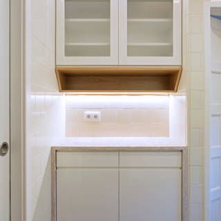 一字型的廚房廚具是沿著牆面所設置的,因此非常適合面積有限的居家空間,這也是一般家庭最常見的廚房設計。依照你選擇的材質與設備的不同,一字型廚房的費用約為 15-20 萬元不等。